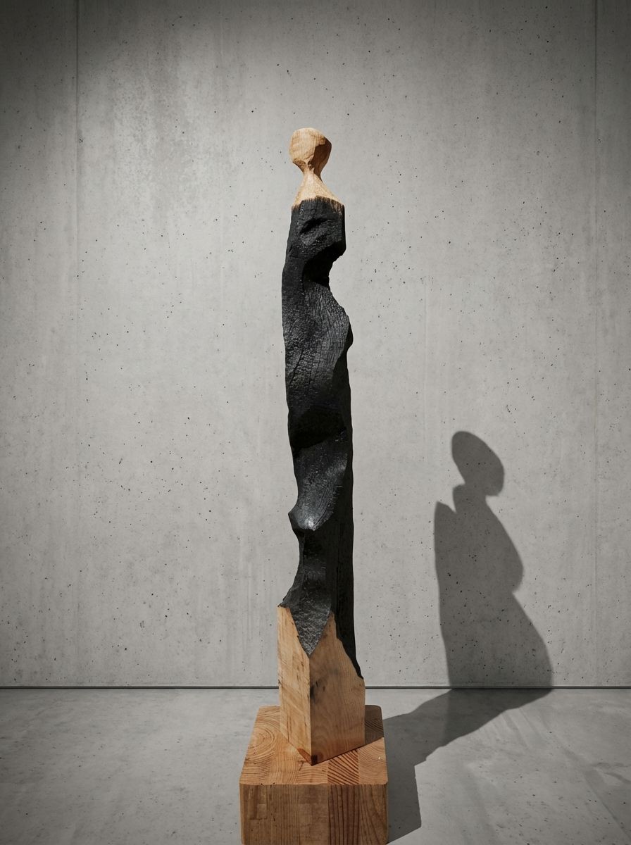 In SENSECTION nutzt Martin Gruber das Element des Feuers nicht als zerstörerische Kraft, sondern als Medium der Verklärung. Das karbonisierte Holz – tiefschwarz, lichtabsorbierend und von einer fast samtigen, archaischen Tiefe – entzieht sich der herkömmlichen Zeitlichkeit.