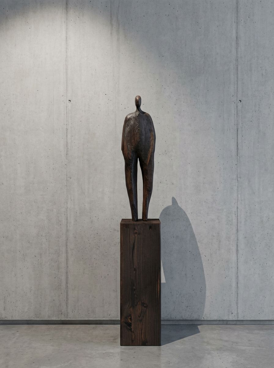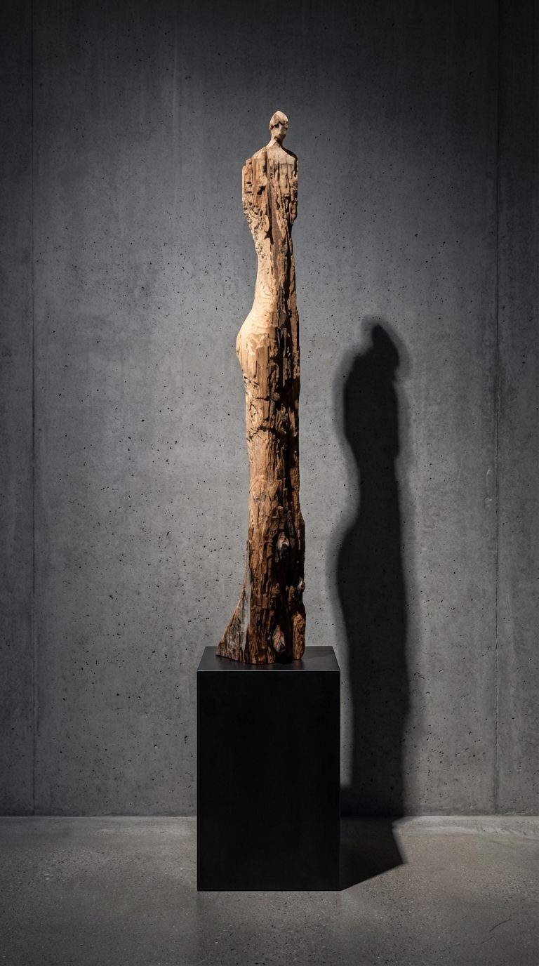 Die Wahl des Mediums – karbonisiertes Holz – ist der entscheidende Hebel, um den Wert des Werkes in die Sphären eines Giacometti zu heben. Hier geht es nicht mehr nur um Form, sondern um die Metamorphose der Materie. In der Alchemie der Kunst wird das Vergängliche (Holz) durch das Feuer (Reinigung) in den Zustand des Ewigen (Kohlenstoff/Diamant-Struktur) überführt.