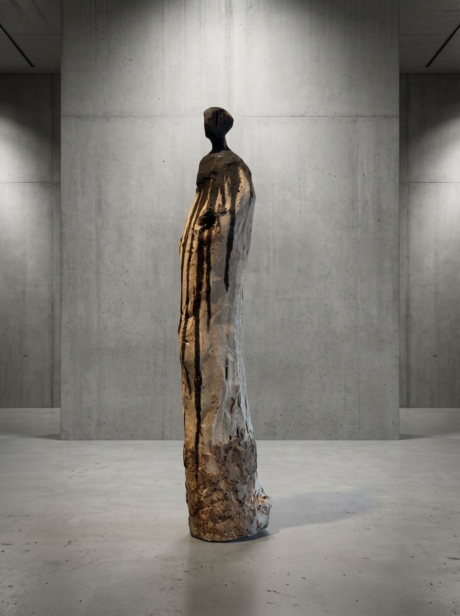 Die Absorption des Nichts (Carbon): Der untere Bereich der Stele sowie der massive Sockel verlangen nach einem gedämpften Umgebungslicht. Das carbonisierte Holz fungiert hier als „schwarzes Loch“ der Wahrnehmung; es schluckt das Licht beinahe vollständig. Diese totale Absorption erzeugt eine visuelle Schwere und Tiefe, die das Werk im Raum verankert und dem Betrachter die physische Unausweichlichkeit der Materie demonstriert.