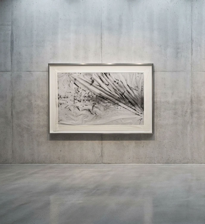 Der Ruß fungiert nicht bloß als Material, sondern als epistemischer Rest – als sedimentierte Erfahrung eines Moments, in dem Energie, Zeit und Bewegung in eine fragile visuelle Ordnung überführt werden. Die diagonalen Einschreibungen wirken wie Diagramme eines Ereignisses, das sich der eindeutigen Rekonstruktion entzieht. In dieser Unschärfe entsteht der höchste Wert der Erkenntnis: nicht Gewissheit, sondern die Fähigkeit, Unsicherheit produktiv zu denken.