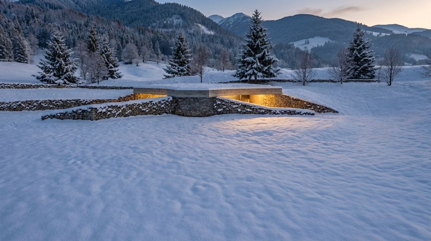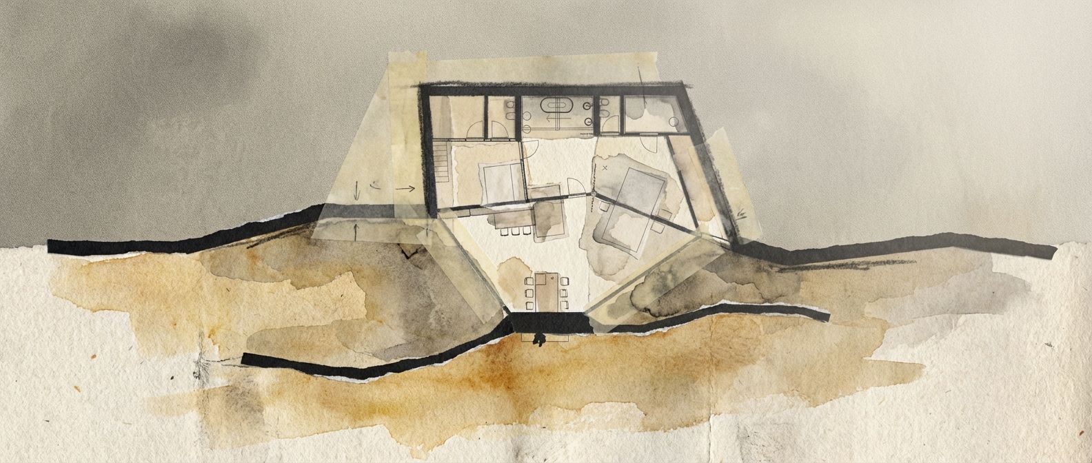 Diese Architektur versteht sich als eine räumliche Operation innerhalb eines topografischen Kontinuums. Zwei Natursteinmauern werden als primäre tektonische Setzungen gelesen, aus deren Beziehung ein Raum hervorgeht, der sich als gefasste Leere artikuliert. Die Landschaft wird dabei nicht überformt, sondern in eine neue räumliche Lesbarkeit überführt, indem Oberfläche zur Unterfläche wird. Die Wand als statischer Träger und selbst massiv, in die Landschaft auslaufend und unterschiedliche Zustände derselben Schichtung erscheinen.