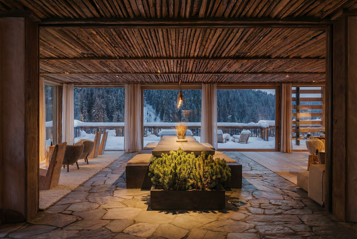 Materialität: Die Verwendung von rohem Holz und Stein ist kein ästhetischer Selbstzweck, sondern eine Rückbesinnung auf die ökologische Vernunft und die atmosphärische Beständigkeit.
