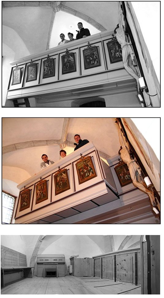Mechanisch ausfahrbare Empore, um Platz zu schaffen für den Kirchenchor, und einen Kirchenumbau zu vermeiden. Das Projekt wurde als Vorzeigeprojekt in Südtirol bei mehreren denkmalgeschützten Kirchen umgesetzt.